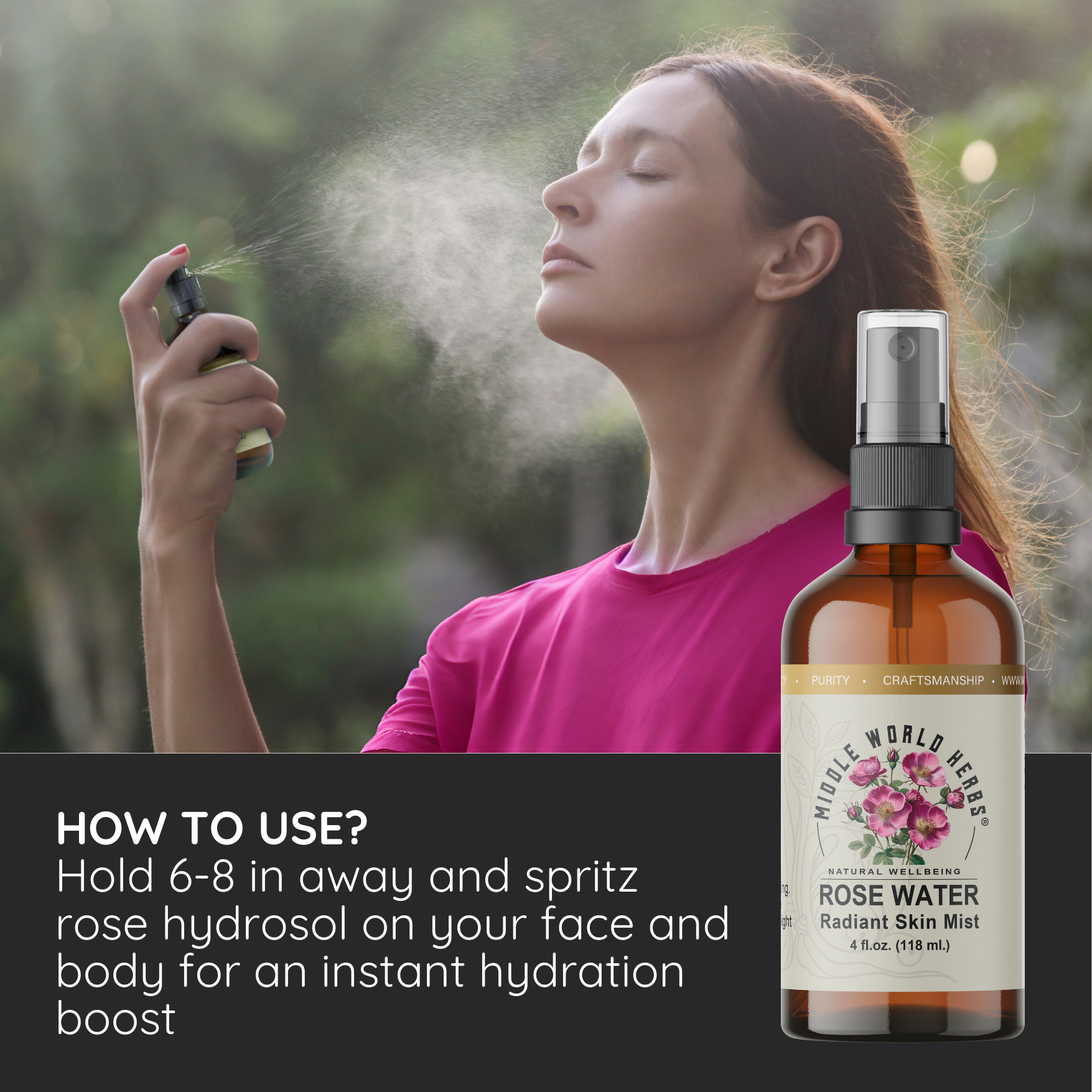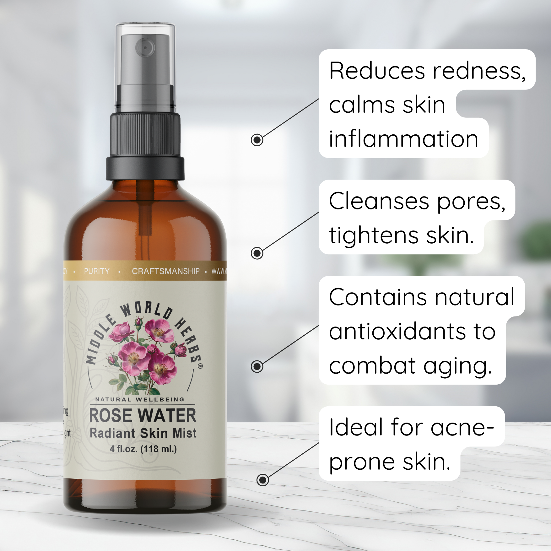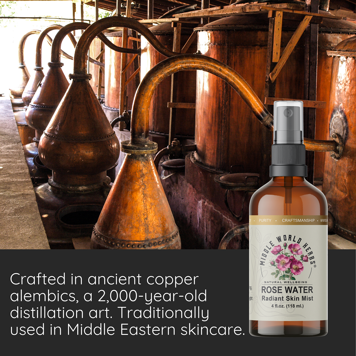 Middle World Herbs Rose Water is distilled in small batches using traditional copper stills, made from the finest Organic Rosa Damascena (Damask Rose) petals. It is one ingredient, genuine and pure hydrosol. It offers a multitude of skin benefits, all while providing a luxurious, refreshing experience.
