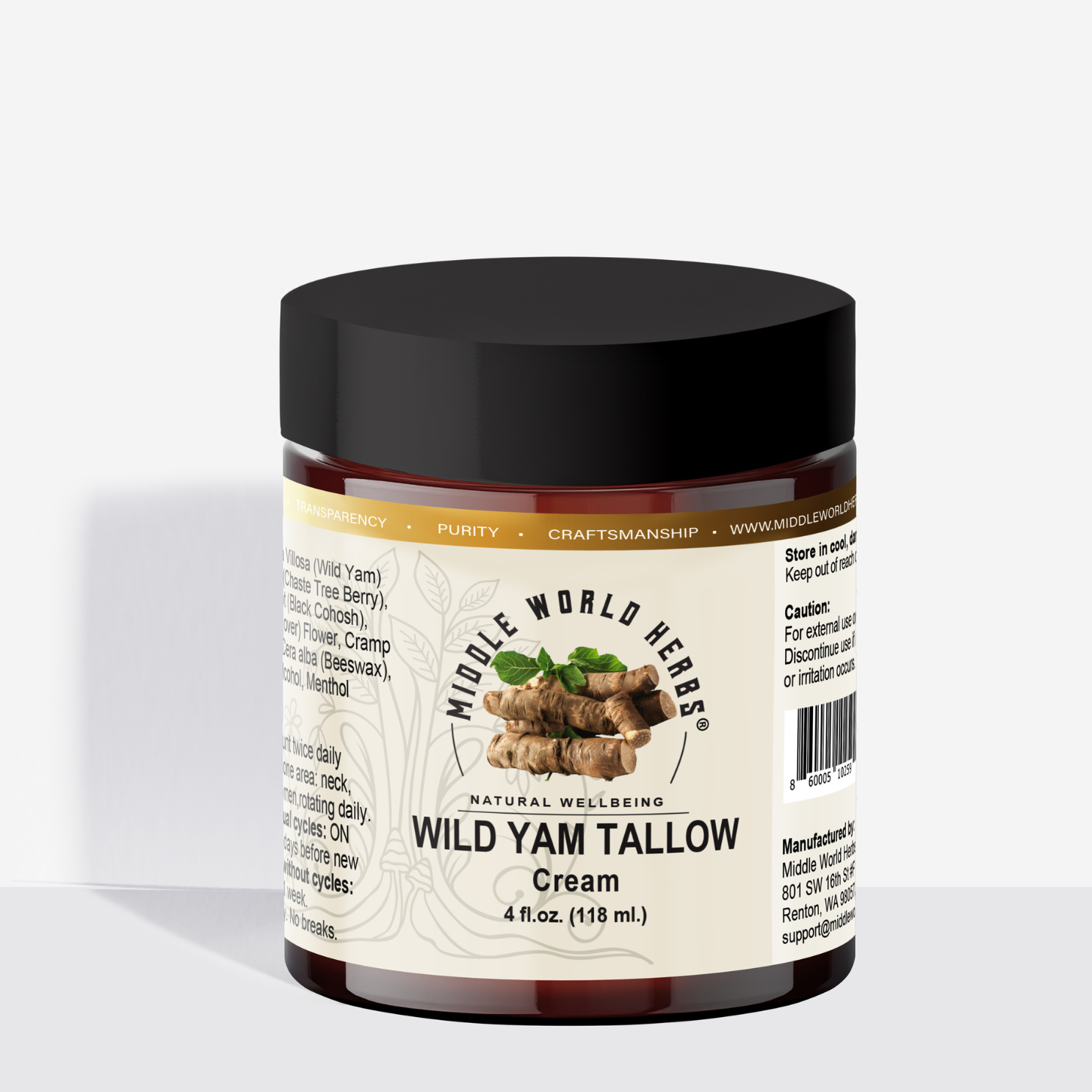 Our Wild Yam Tallow Cream is a carefully formulated, natural product designed to support body during natural cycles and transitions. Crafted from time-honored botanicals and a nourishing tallow base, it is a comfort skincare product, made for those seeking balance and harmony.